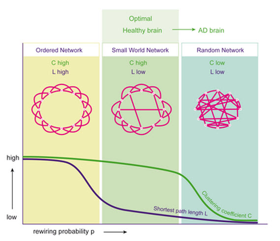Izquierda: modelo solicitado con alta C y L alta, media: modelo de mundo pequeño con alta y baja C L, derecha: modelo aleatorio con bajo C y bajo L. Adaptado de Watts y Strogatz, Naturaleza 1998.